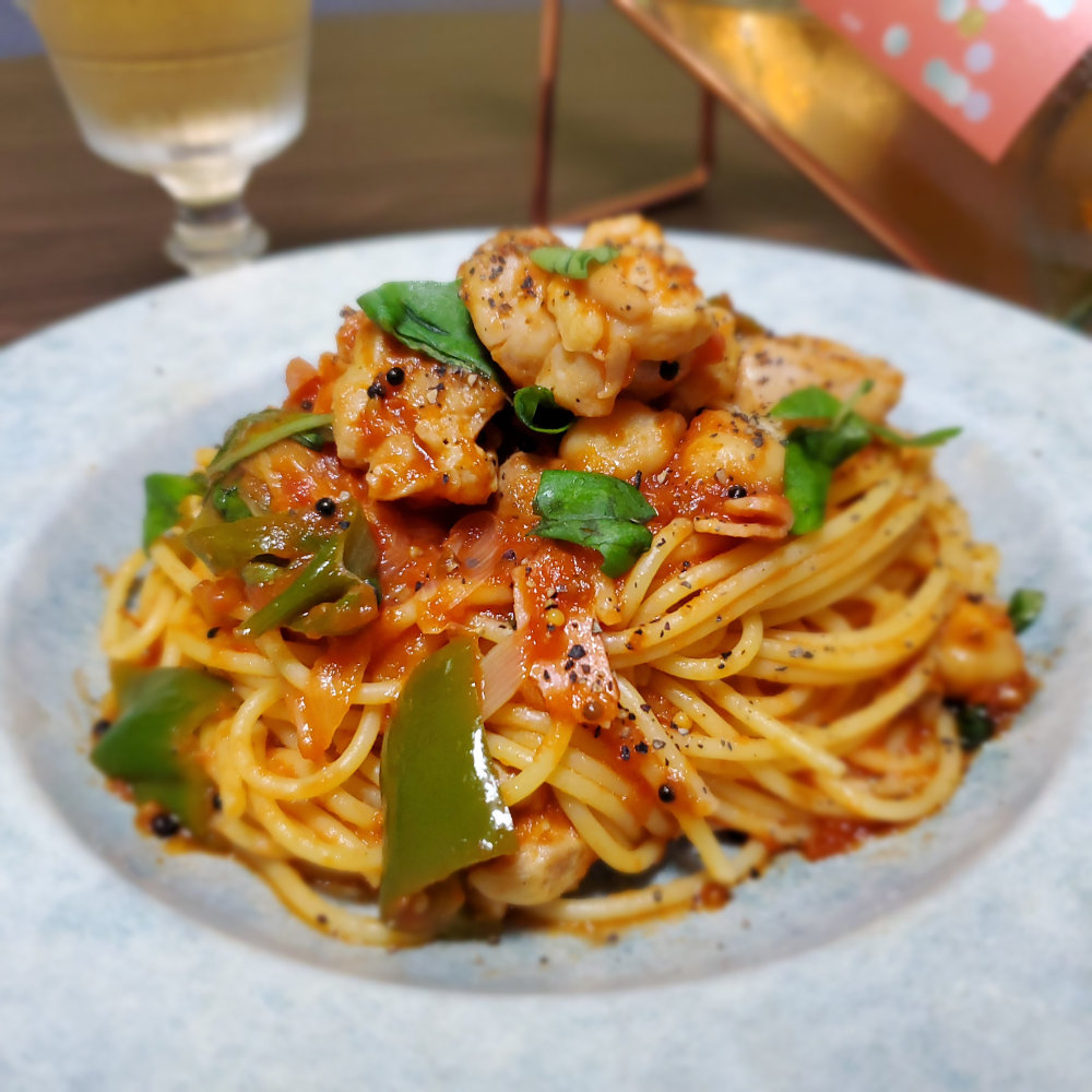 鶏もも肉とひよこ豆のトマトパスタトマトソースのパスタは、定番中の定番すぎて、ちょっとつまらないですね。でも、やっぱりロゼとの相性はいいので、ペアリングに迷ったらトマト味でいいと思います。