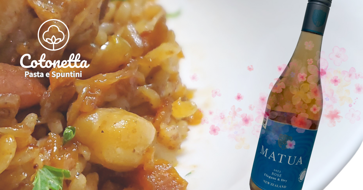 鶏もも肉とひよこ豆のトマトパスタトマトソースのパスタは、定番中の定番すぎて、ちょっとつまらないですね。でも、やっぱりロゼとの相性はいいので、ペアリングに迷ったらトマト味でいいと思います。