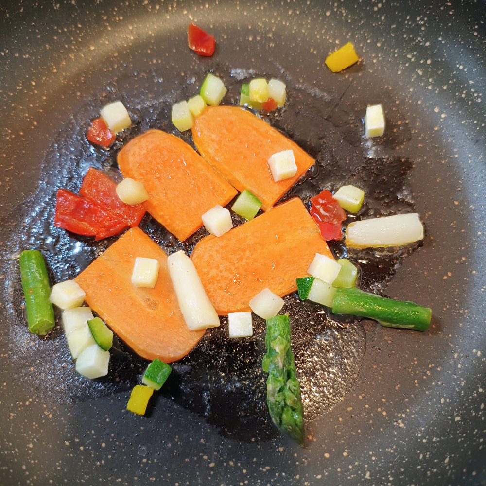 フライパンにバターを溶かして、にんじんと冷凍野菜を炒めて取り出す。