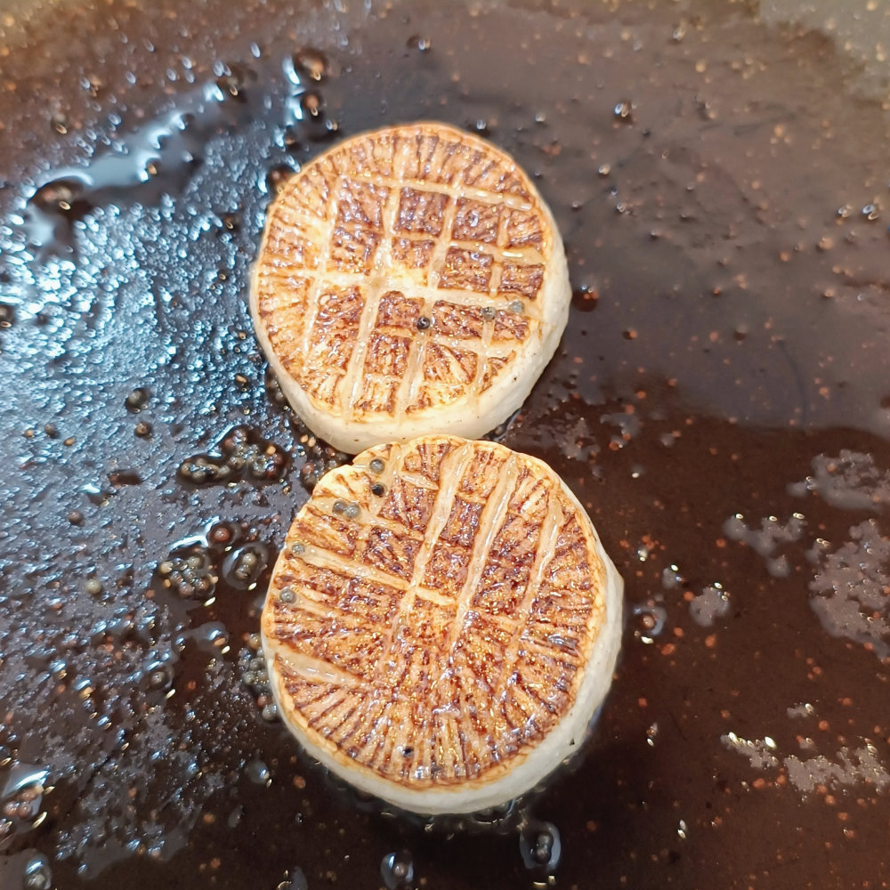 フライパンにオリーブオイルを熱し大根を両面焼く。串を刺して確認しながら火が通るまで焼く。