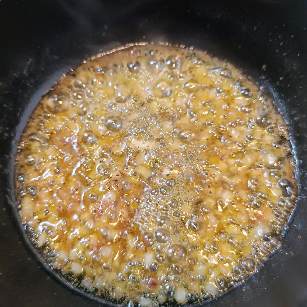 小さい鍋にオリーブオイル、アンチョビ、おろしにんにく、冷凍玉ねぎみじん切りを入れて弱火で火を通す。アンチョビを潰しながら混ぜる。
