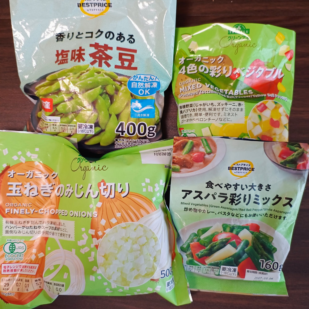 これらの冷凍野菜を適当に混ぜて使います。必ずしもコスパは良くありません。でも、野菜を買ってきて使っても、